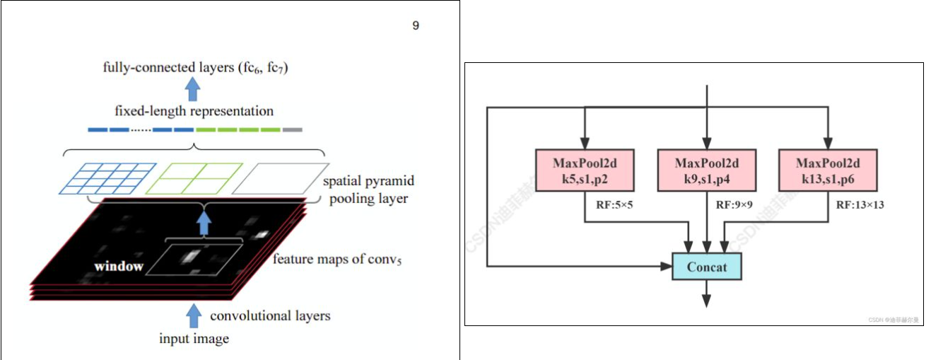 - YOLOv 5 改空间空间金字塔池化 (SpatialPyramidPooling,SPP) 得到,主要思想是:将输入串行通过多个不同大小的 MaxPool,然后做进一步融合,两者的作用是一样的,但后者效率更高