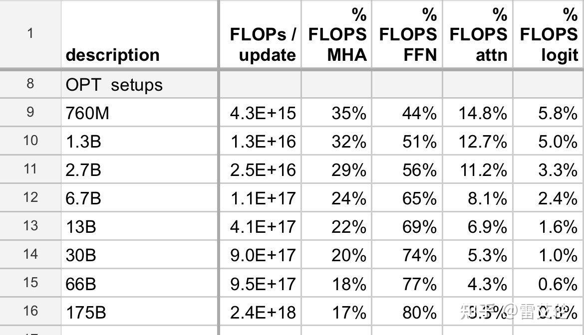 - 当模型大了后,真正消耗算力(FLOPS)的,还是 MLP(FFN),自注意力(attn)和多头(MHA)只占小部分