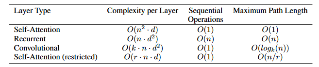 - 复杂度:self-attention layer 用常数次 O (1) 的操作连接所有位置,而 recurrent layer 需要 O (n) 顺序操作。在计算复杂度方面,当序列长度 N 小于表示维度 D 时,self-attention layers 比 recurrent layers 更快。为了提高包含很长序列的任务的计算性能,可以仅在以输出位置为中心,半径为 r 的的领域内使用 self-attention