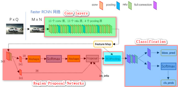 - Conv layers: 首先使用一组基础的 conv+relu+pooling 层提取 image 的 feature maps,该 feature maps 被共享用于后续 RPN 层和全连接层,输出为:(M/16)x(N/16)