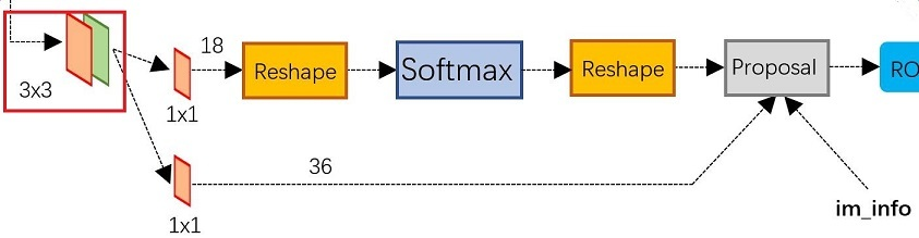 bbox reg 回归:计算对于 anchors 的 bounding box regression 偏移量,以获得精确的 proposal。使用 1x1 的卷积,将输入调整为 36,表示每个位置 9 个锚框的 x,y,w,h