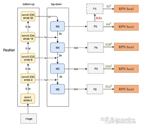 - 1)backbone: 原图短边被 resize 到 800 像素,输出为 4 个不同尺寸的 feature map(C2、C3、C4、 C5 )