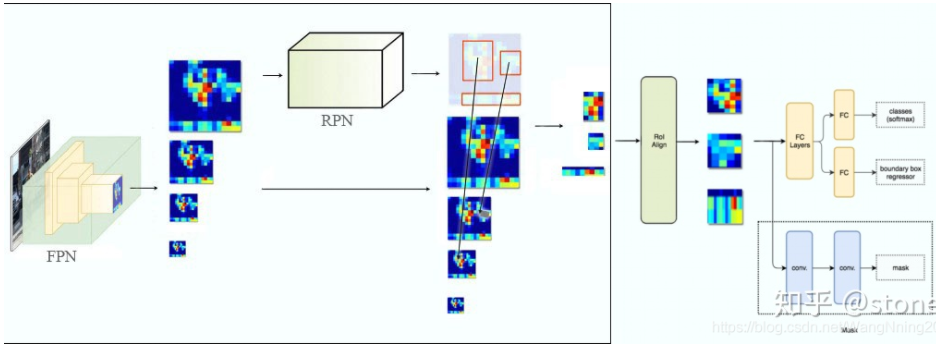 - ROIAlign 部分:对获得的 ROI 区域执 ROIAlign 操作,即先将原图和 feature map 的 pixel 对应起来,然后将不同目标的 feature map 转为相同大小的 featrue