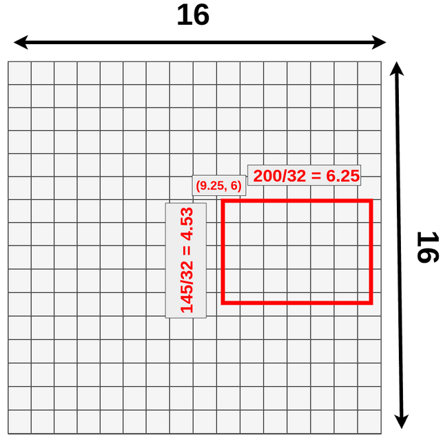 - 假设模型输入是:3x512x512,经过特征提取得到 512x16x16 的特征,即数据下采样 512/16=32 倍,现有目标位置 (192,296),大小 145x200
