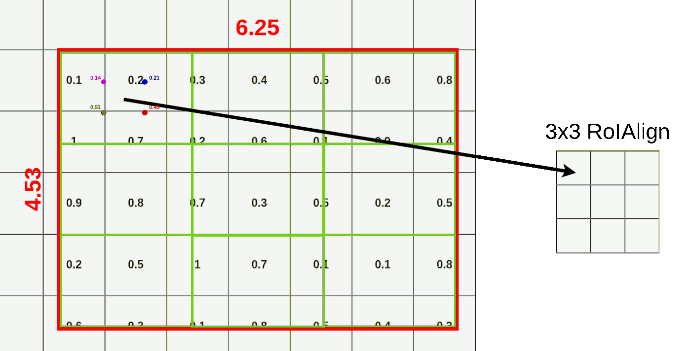 - RoIAlign:映射时并没有取整的过程,可以全程使用浮点数操作,最后通双线性插值 (BilinearInterpolation) 计算浮点数位置的像素值 (特征值)