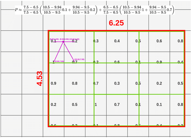 - 在每个框内取 4 个采样点,取样方法为将框横纵方向进行 3 等分,取框内的划分点作为采样点,如第一个点坐标 (X_box+(box_width/3) x1, Y_box+(box_height/3) x1)=(9.94, 6.50) 、第二个点坐标 (X_box+(box_width/3) x1, Y_box+(box_height/3) x2) =(9.94, 7.01)…