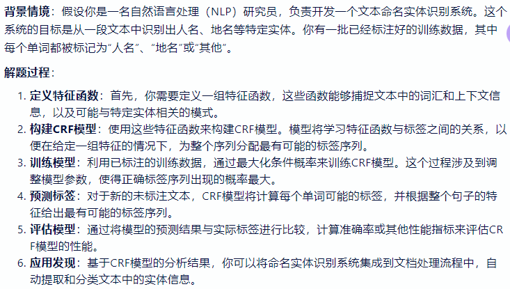 - 一种用于构建预测模型的概率图模型,特别是在序列数据标注和分割任务中。与隐马尔可夫模型(HMM)不同,CRF 没有马尔可夫假设,即当前状态的概率仅依赖于前一个状态,而是允许在给定一组特征的条件下,对整个序列的标签分配进行建模