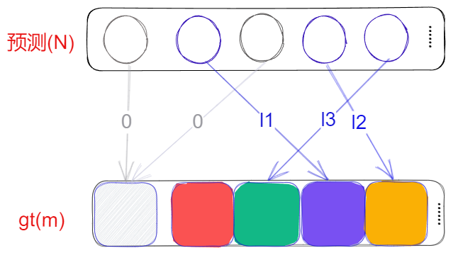 - DETR 的 transformer decoder 输出 N 个目标的预测集合,下一步是如何将这 N 个预测结果分配到 gt 目标上去,以便计算损失,驱使网络学习