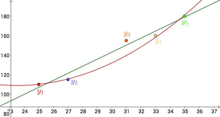 2)最小化误差:即求得误差的极小值,这可以通过对求导公式 = 0 求出,得到方程组后求解参数 a=7.2,b=-73,最终结果是绿色线的结果,也可以假设关系二次关系,求得红色线的式子