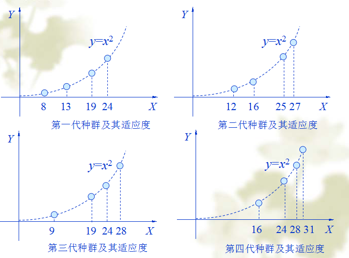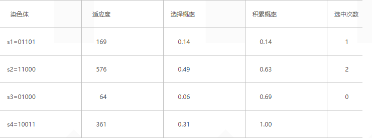 - 变异: 设变异率 pm=0.001, 群体 S1 中共有 5×4×0.001=0.02 位基因可以变异。 0.02 位显然不足 1 位,所以本轮遗传操作不做变异