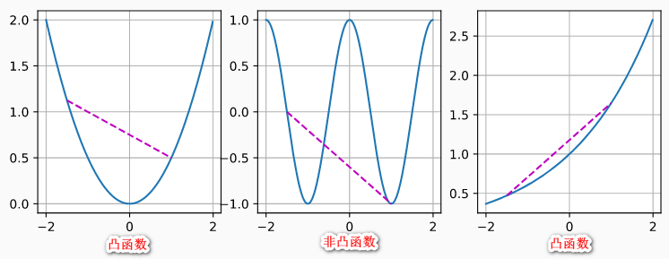 - 凸函数:凸集上的函数是凸函数。凸函数的每一个局部极小值也是全局极小值 (f (x) = 0.5x^2 )