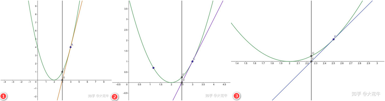 - 上图是 的牛顿法求解过程,假设初始化位置为 A 点,求 A 点的斜率与 x 轴的交点 B,可知 ,只要不断迭代这个过程,就可求出 f (x) 的极小值。