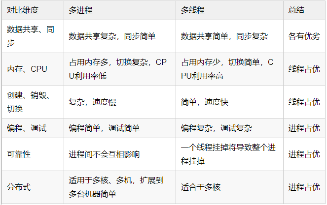 - 多进程的程序要比多线程的程序健壮:但在进程切换时,耗费资源较大,效率要差一些