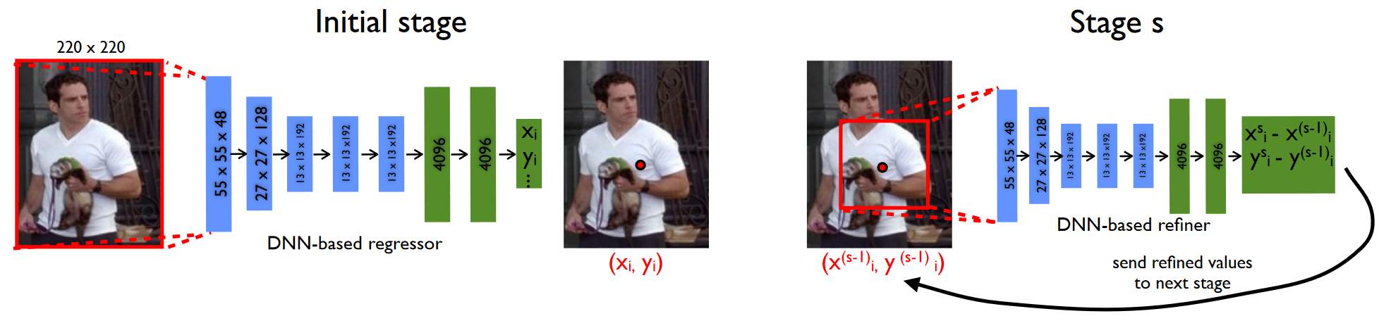 - 训练一个级联的姿态回归器。在第一个阶段,先粗略的估计出部分的姿态轮廓,然后在下个阶段,将通过已知关键点位置不断的优化其他关键点的位置。每个 stage 都使用已经预测的关键点来切出基于这个关键点的邻域,这个子图像将被用于接下来的网络输入,而接下来的网络就会看到更高分辨率的图像,最终达到更好的精确率