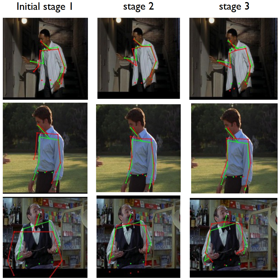 - 上图是三级级联网络预测姿态 (红色) 和 ground truth(绿色)