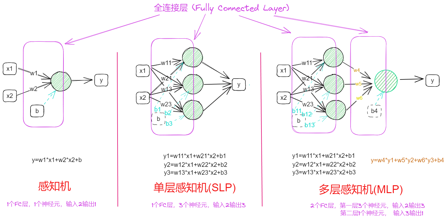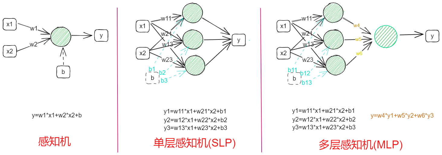 - 单层感知机 (SLP):中图是一个 2 输入、包含 3 个输出节点的单层感知机,经过参数加权累加和后输出,输出是超平面
