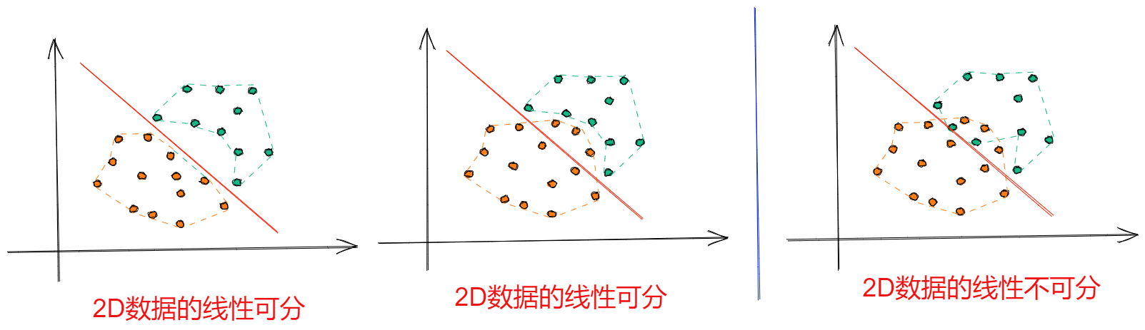 - 线性不可分:计算所有样本的凸包,如果凸包内值包含 2 个类别以上,则是非线性可分