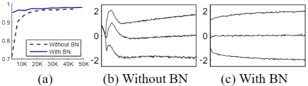 - 收敛速度: 通过比较各个曲线的收敛点,可知加了 BN 的实验,可以使用更大学习率,其收敛速度更快