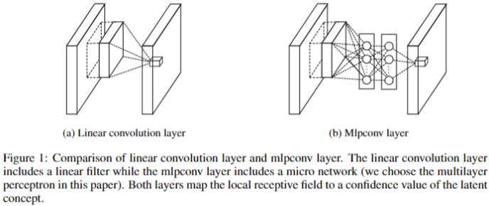 通过引入子网络结构代替纯卷积中的线性映射部分,替换传统卷积模式 (卷积 + 激活 + Dropout) 的卷积方式;结尾使用全局池化替代 Dropout,提高泛化能力的同时,减小网络