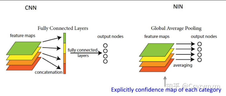 - 一般来说,卷积神经网络会使用全连接层作为分类层,而 NIN 在最后的分类层使用全局池化 (Global Pooling) ,如分类层前的输出是 6x6x10,全连接作为分类层时,首先是将特征展平为 6x6x10=360 长度的特征,然后再使用全连接;而全局池化直接对 10 个特征图进行池化,得到 10 个值,作为 10 分类分类的概率