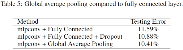 - 使用全局池化后,NIN 网络比使用全连接作为分类层模型效果更好