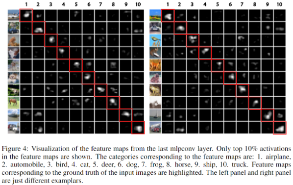 - 上图横向为示例图片,纵向为每个图最后一层 mlpconv 的输出 (6x6x10),输入全局池化 (Global Pooling) 前,通过上图看不同图片对应每个类别的响应位置