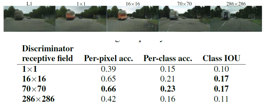 - 这个鉴别器试着分辨每一个 N × N 的 Patch 是真的还是假的,然后平均所有的相应来得到最后的输出 D,图中可以看出 70x70 效果最好