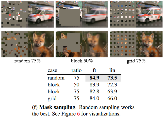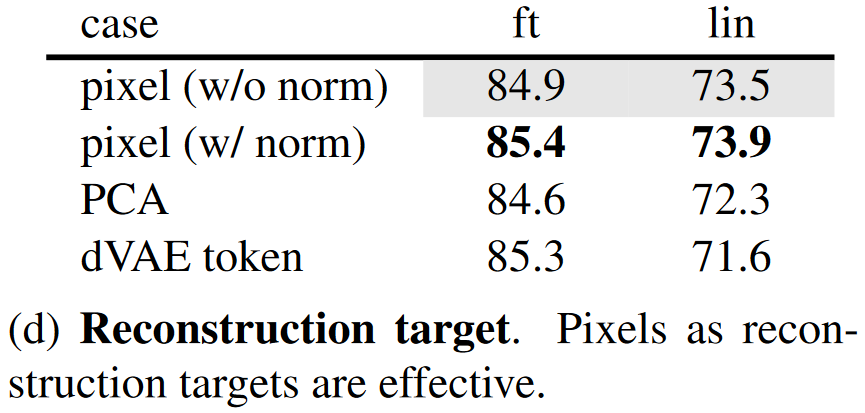 - MAE 最终目标构建策略使用的是像素级别的重建(pixel),作者还和 BEiT 那种预测 token 的方式以及 PCA 的方式