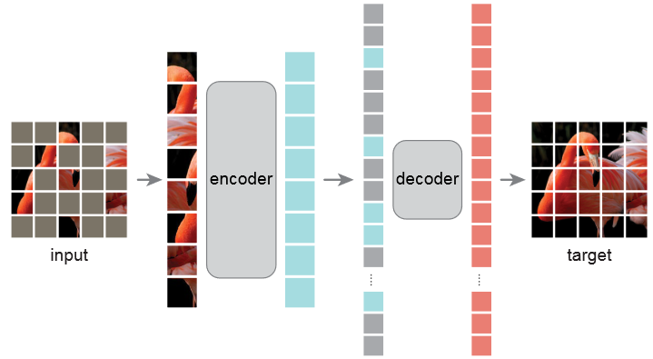 - 首先将 input image 切分为 patches,执行 mask 操作,然后只把可见的 patches 送入 encoder 中,再将 encoder 的输出(latent representations)以及 mask tokens 作为轻量级 decoder 的输入,decoder 重构整张 image