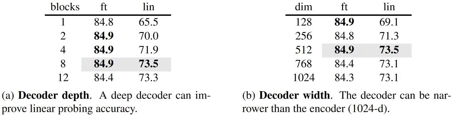 - 宽度:MAE decoder 的宽度也有类似结论,实验结果显示 512 的宽度性能最佳