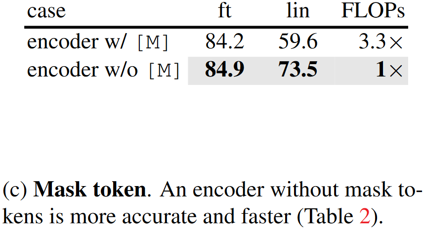 - 实验表明,encoder 如果接收 mask tokens,performance 甚至会降低 14%,因此 encoder 只接收 visible tokens,既能提升性能,又能降低计算量加速训练