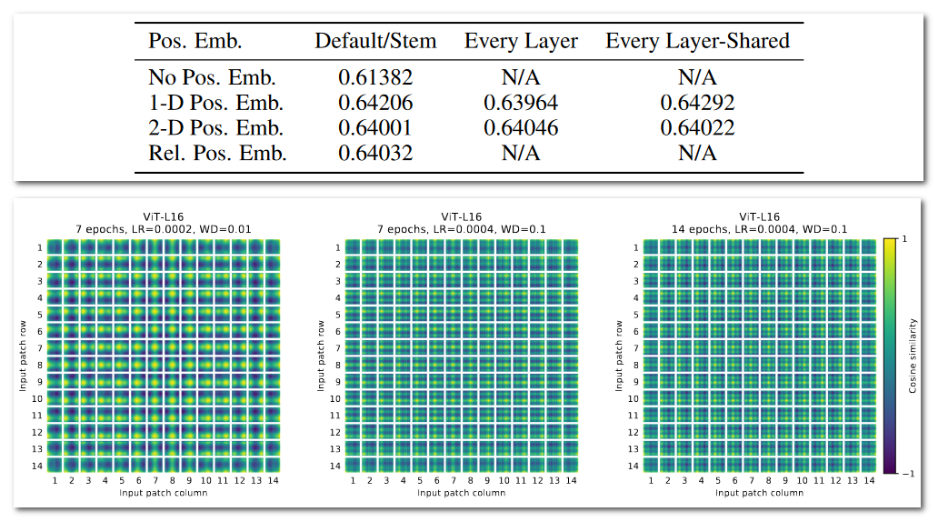 - 论文比较了 4 种嵌入编码的方式,效果差不多,因为分类任务对位置信息不敏感,如果是其他的 transformer 处理的任务,如果不加,效果很差