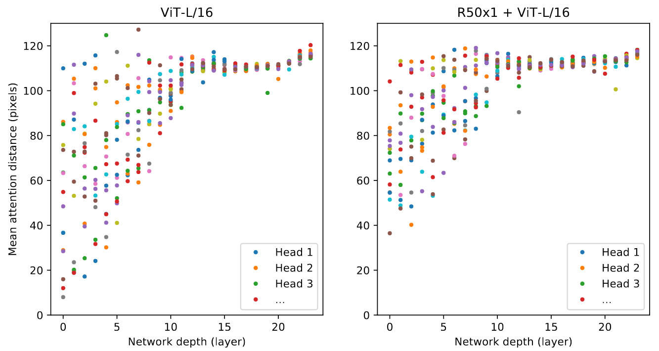 - Mean Attention Distance 主要体现自注意力机制的影响范围,比如认定注意力 > 0.5 的两个位置形成注意力,然后计算满足这个阈值的位置平均距离,这就类比于 CNN 的感受野。结果表明:前面层的 “感受野” 虽然差异很大,但总体相比后面层 “感受野” 较小;而模型后半部分 “感受野” 基本覆盖全局,和 CNN 比较类似,说明 ViT 也最后学习到了类似的范式