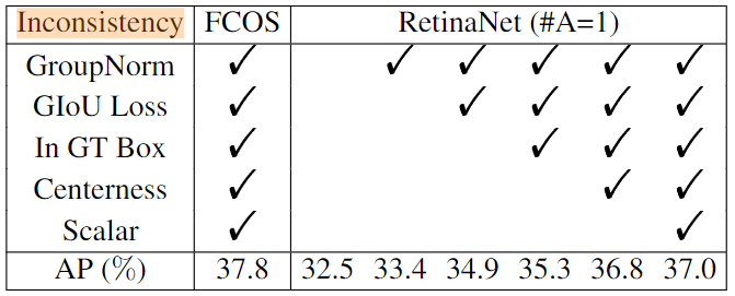 - 论文比较了 FCOS 和 anchor=1 时的 RetinaNet,训练时使用相同的正样本选择思路,并使用 GroupNorm 等操作消除不确定性后,发现最终两者效果相近