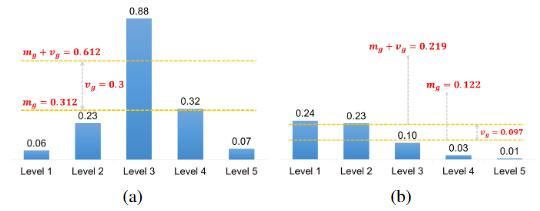 - 使用均值和标准差之和作为 IoU 阈值。对象的 IoU 均值 mg 是预设锚点对该对象的适用性的度量。如图 (a) 所示的高 mg 表明它具有高质量的候选者,IoU 阈值应该很高。如图 (b) 所示的低 mg 表明它的大多数候选者都是低质量的,IoU 阈值应该很低。此外,对象的 IoU 标准偏差 vg 是哪些层适合检测该对象的度量