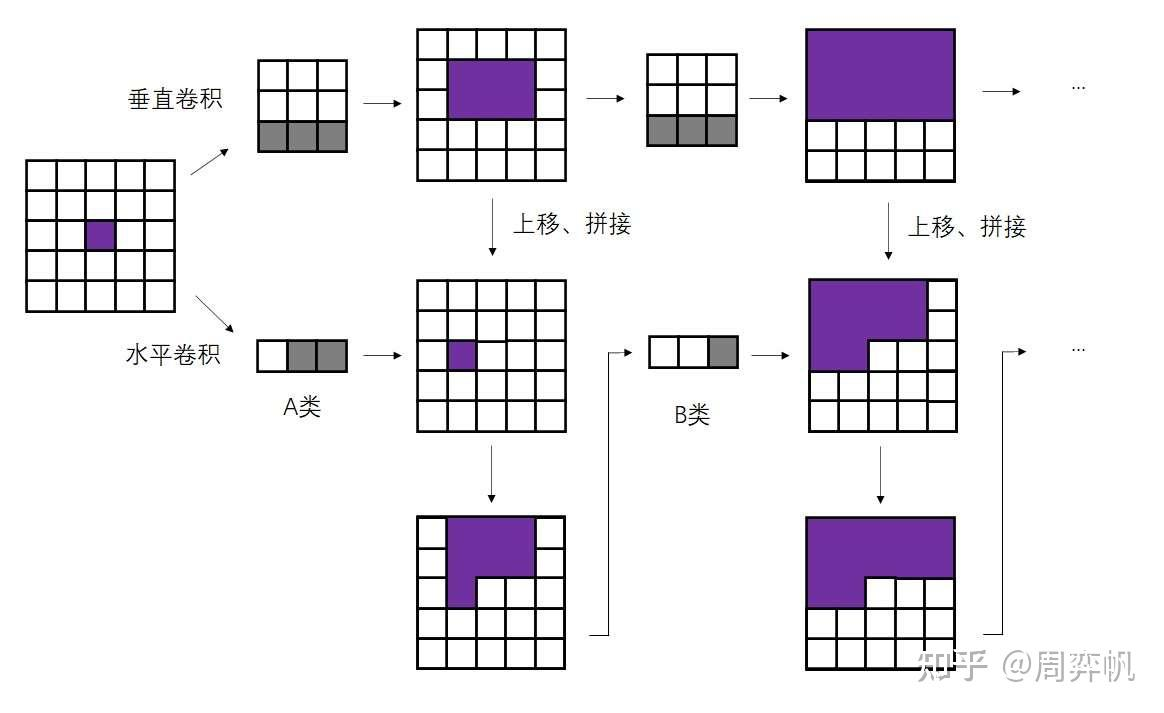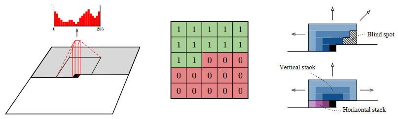 - 分解后包括 horizontal stack 和 vertical stack2 个卷积。其中 horizontal stack 只处理当前所在行左边的 pixels,而 vertical stack 处理上面所有行的 pixels,我们把两个 conv stack 结合在一起,就可以实现想要的感受野,并且可以避免盲区的出现