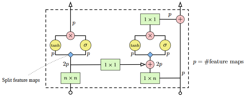 - 在卷积中引入 LSTM 的 gate 机制,将两个 masked conv 间的 ReLU 用 gate activate 单元来替换