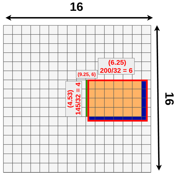 - 假设模型输入是:3x512x512,经过特征提取得到 512x16x16 的特征,即数据下采样 512/16=32 倍,现有目标位置 (192,296),大小 145x200
