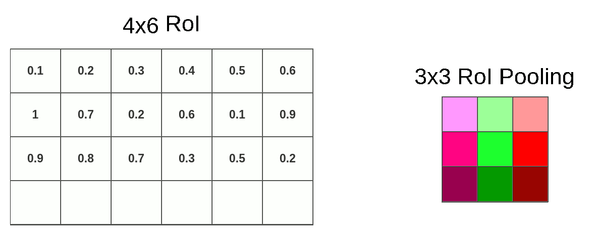 - ROI 区域池化: 假设特张图上的值如下图,对上图黄色 + 绿色区域进行 3x3 的 ROI pooling,由于 4/3=1.3, 所以每个 bin 为 1 行数据下采样,最终得到绿色 3x3 新特征图,由图可知我们彻底失去最后一行