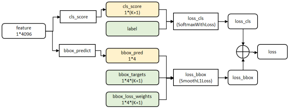 - 5)获选框的分类与回归:利用 Softmax Loss (探测分类概率) 和 Smooth L1 Loss (探测边框回归) 对分类概率和边框回归 (Bounding box regression) 联合训练