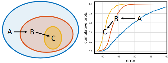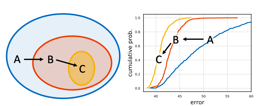 - 如上图分别是 3 个设计空间下,采样模型跑出的结果,看以看出从 A->B->C 搜索空间越来越小,模型性能越来越好