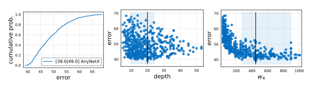 - 图示展示了用个抽样模型计算的 AnyNetX 设计空间的统计结果。左:误差经验分布函数(EDF)是我们可视化设计空间质量的基本工具。在图例中,分别是最小误差和平均误差(对应于曲线下的区域)。中间:网络深度(块数)与误差的分布。右:第四阶段()的块宽度分布与误差。蓝色阴影区域包含置信度的最佳模型(通过经验引导获得),黑色垂线是最可能的最优值