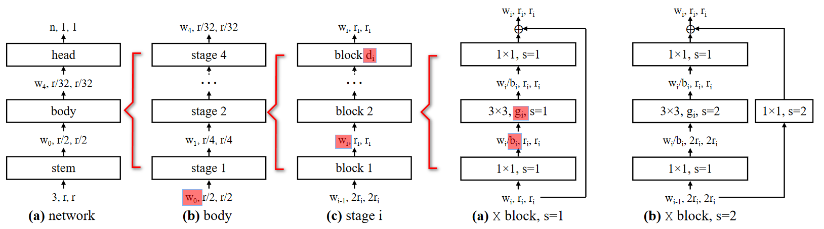 - 一点点增加约束,搜索空间迅速下降,最后的 RegNet 作者认为一个 stage 的所有 block 的 应该是一致的