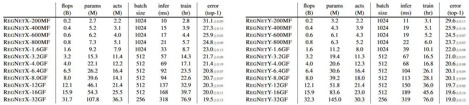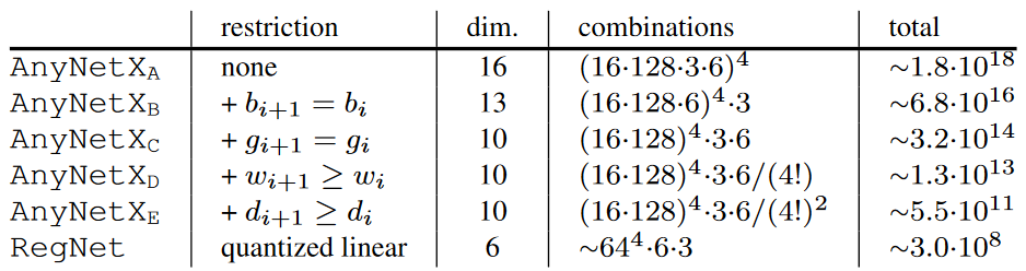 - AnyNetXA: d <=16,W <=1024 (8 倍数), b={1,2,4}, g={1,2,4,8,16,32},但是 4 个 stage 这样组合太多了
