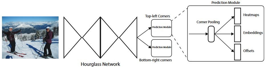 通过预测图片目标的左上角(top-left corner)点、右下角 (bottom-right corner) 点坐标实现对物体的检测