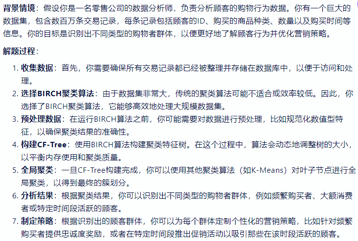 - 一种用于大规模数据集的聚类算法。它通过构建聚类特征树(CF-tree)来有效地进行聚类,同时对内存使用进行了优化。BIRCH 特别适合于数据集无法全部装入内存的情况,因为它可以在磁盘和内存之间高效地移动数据