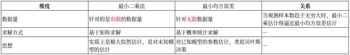 - 均方误差=方差+偏差的平方,当估计量无偏时,均方误差等于方差。所以,当满足最小二乘法条件且估计量是无偏估计量,那么求最小均方误差等价于最小二乘法