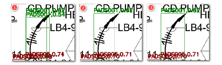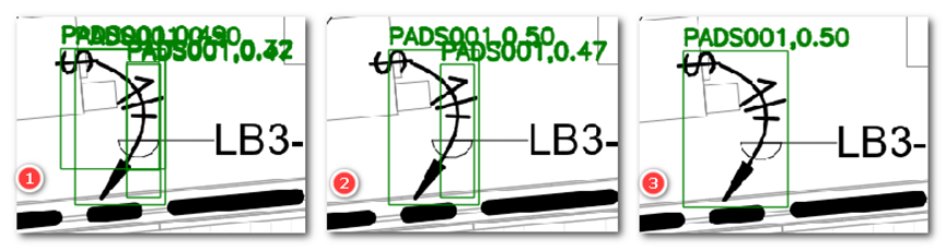 实践证明,加入 “重叠面积对待分析预测框面积占比” 的阈值后,可以解决单纯面积阈值过滤方式的两个问题,一是重叠时 nms 的 IOU 阈值大于实际 IOU 导致无法过滤的情况,如下图,标号 1、2、3 分别是无 nms、面积 nms、面积 nms+“重叠面积对待分析预测框面积占比” 阈值,从标号 1 看出,AI 输出 3 个检测框,从标号 2 可以看出,由于计算的 IOU 小于 nms 的过滤 IOU 阈值,所以有一个重叠框没被过滤,在使用 “重叠面积对待分析预测框面积占比” 阈值后,内部的预测框被过滤。