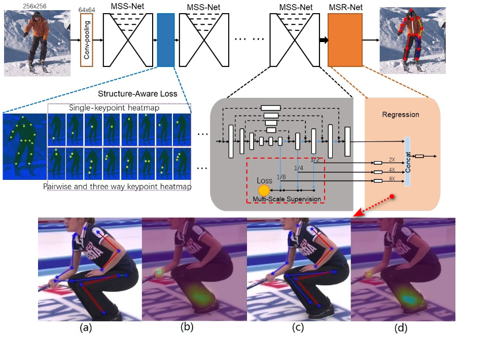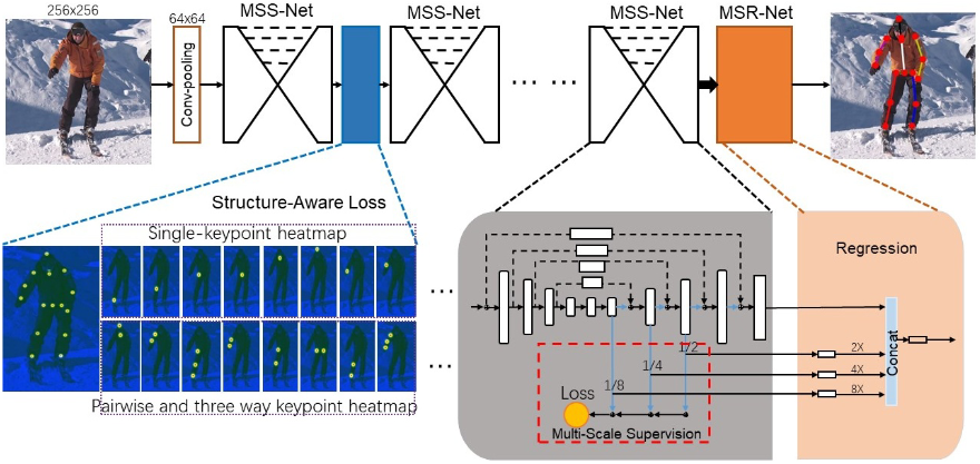 MSSA 认为尺度和遮挡是影响人体姿态估计的关键,因此提出多尺度监督网络 (MSS-net) 和多尺度回归网络 (MSR-net) 提升网络对不同尺度人体的学习能力