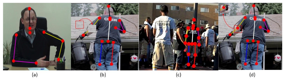 - 一种关键点 masking 数据增强方案来增加训练网络的遮挡能力,有几种不同的遮挡:被东西遮挡、自遮挡、被其他人遮挡。(a) 表示左手腕被遮挡住了,但可以通过可见关键点的连接结构来估计左手手腕的关键点定位。c 表示如果有其他人考的比较近,也会造成很大的麻烦